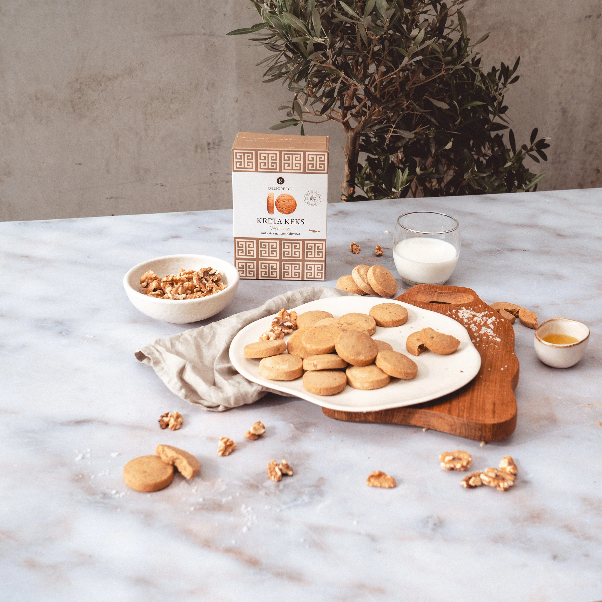 Dieses Keksgebäck zeigt die Verbindung von traditionellem Backhandwerk und hochwertigen Rohstoffen: Olivenöl statt Butter, ganze Walnüsse als Akzent und Gewürze, die eine warme Note schaffen. Herkunft und Qualität werden betont – Handarbeit, sorgfältige Rohstoffwahl und klare Geschmacksführung.