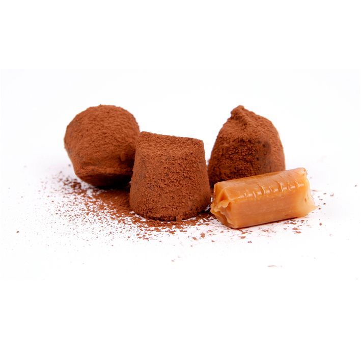 Hergestellt wird dieses Konfekt mit großer Sorgfalt und hochwertigen Zutaten. Zum Einsatz kommen pflanzliche Fette – darunter Kokosnuss- und RSPO-zertifiziertes Palmkernfett – sowie Zucker, fettarmes Kakaopulver, Molkepulver (Milch) und ein Anteil von drei Prozent Karamellstücke, bestehend aus unter anderem Butter, Glukosesirup, Meersalz und Magermilchpulver. Zur Feinabstimmung enthalten die Trüffel zusätzlich Sonnenblumen- und Sojalecithin als Emulgatoren sowie natürliche Aromen für das Karamell- und Vanillinprofil. Allergenhinweise: Soja, Milch (einschließlich Laktose); kann Spuren von Haselnüssen und Mandeln enthalten.