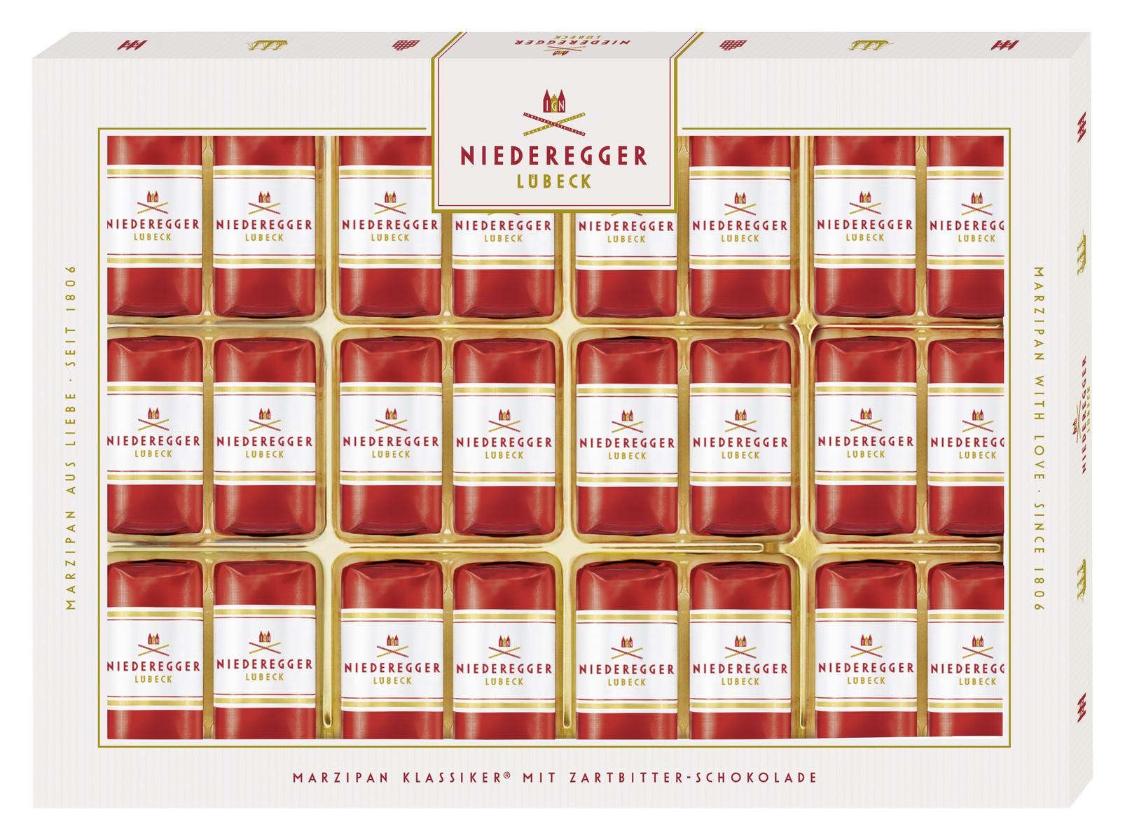 Die Niederegger Marzipan Klassiker® (100 g) steht sinnbildlich für die unverwechselbare Qualität und die über zweihundertjährige Tradition des Hauses Niederegger. Diese feine Marzipanspezialität verkörpert die Essenz des berühmten Lübecker Marzipans – handwerklich perfekt verarbeitet, aus besten Zutaten gefertigt und von einer feinen Schicht edler Zartbitterschokolade umhüllt.