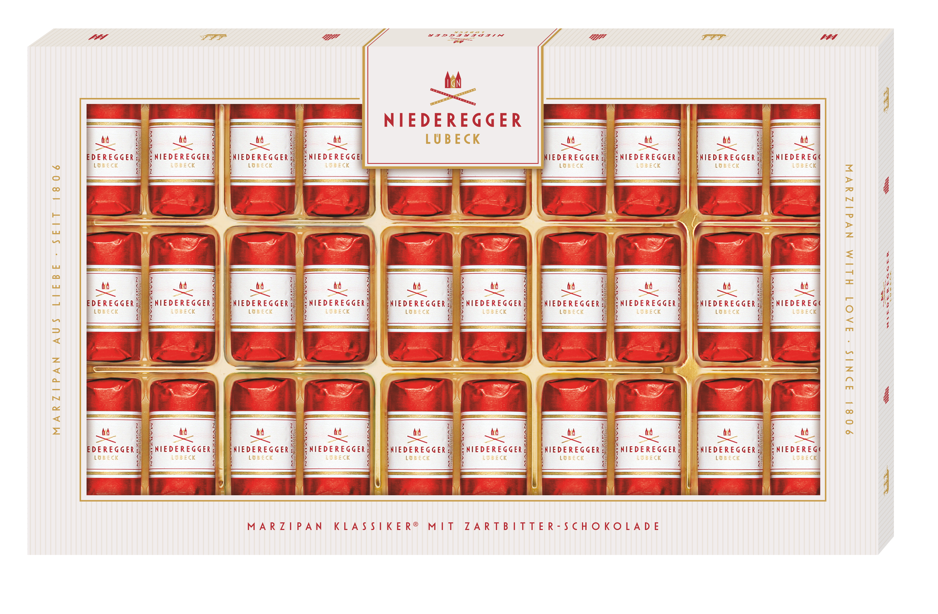 Die Niederegger Marzipan Klassiker® (375 g) verkörpert die Essenz echter Lübecker Handwerkskunst – feinste Qualität, ausgewählte Zutaten und eine Rezeptur, die seit Generationen unverändert für höchsten Genuss steht. Diese edle Geschenkpackung enthält 30 Stück der berühmten Marzipan-Pralinen, liebevoll gefertigt aus besten Mandeln und umhüllt von feiner Zartbitterschokolade.