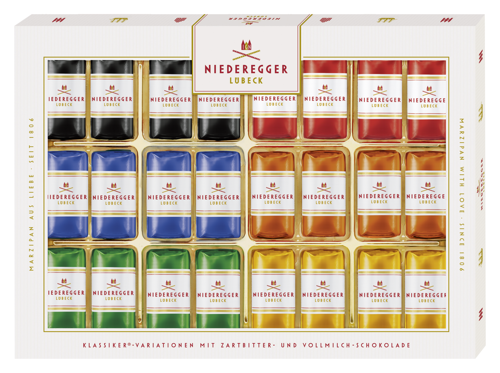 Mit einem Gesamtgewicht von 375 g ist diese Auswahl ideal für das stilvolle Geschenk oder für den bewussten Genussmoment zu zweit oder in kleiner Runde. Sie steht für das, wofür Niederegger seit mehr als zwei Jahrhunderten steht: höchste Confiserie-Handwerkskunst, sorgfältige Rohstoffwahl, kompromisslose Qualität – und das in einer Form, die Genuss und Eleganz verbindet.