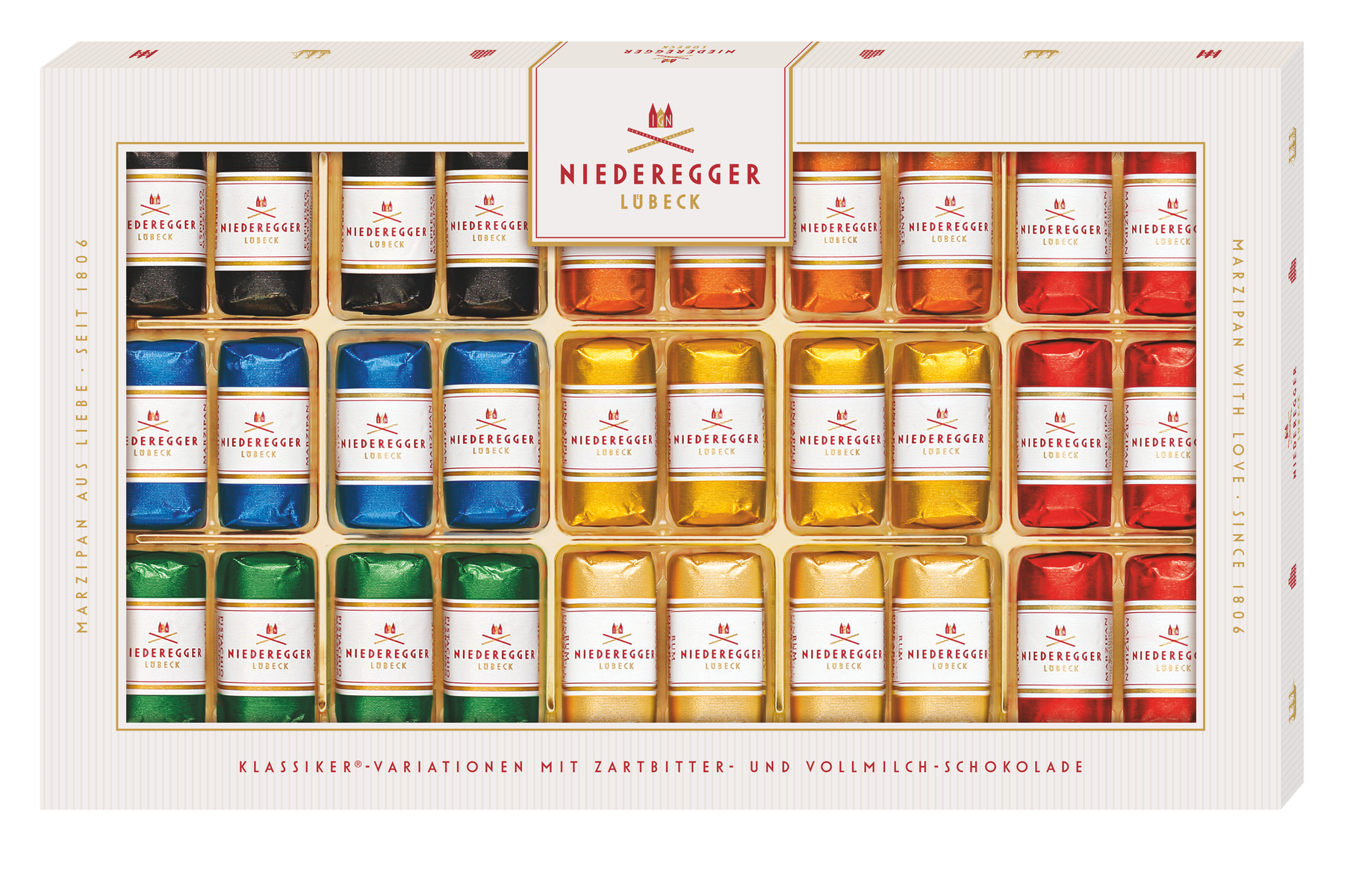 Mit einem Gesamtgewicht von 375 g bietet diese Variation eine ausgewogene und zugleich luxuriöse Auswahl, die sich perfekt zum Verschenken, Teilen oder für den eigenen Genuss eignet. Sie verkörpert alles, wofür das Haus Niederegger seit 1806 steht: unverfälschten Geschmack, erlesene Zutaten, handwerkliche Präzision und die Leidenschaft, aus Marzipan ein Erlebnis für alle Sinne zu machen.