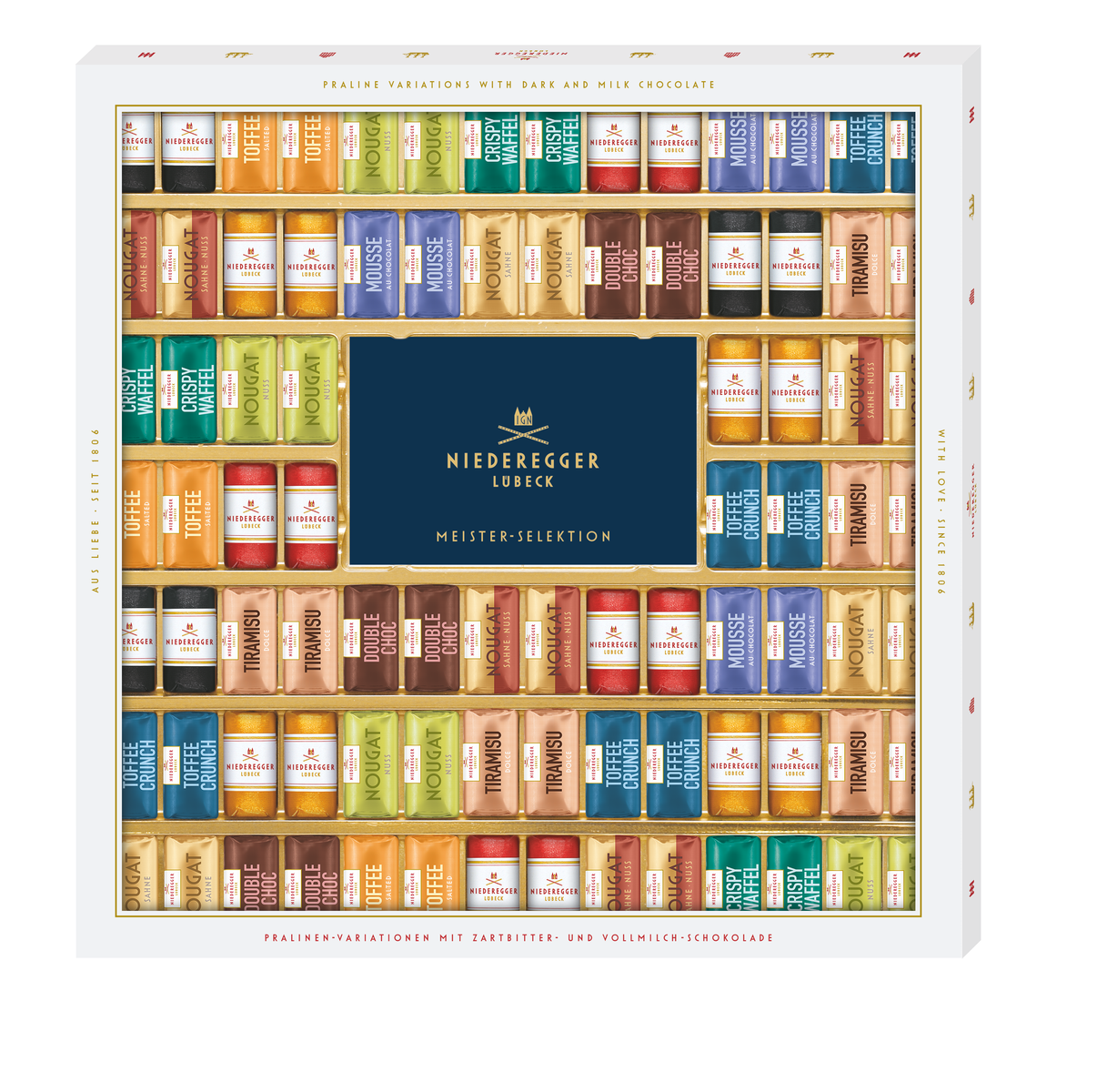 Die Niederegger Meister-Selektion (1.075 g) ist ein Fest für Genießer und Liebhaber feinster Confiserie-Kunst. Sie vereint in einer edlen Präsentationsbox 86 handgefertigte Köstlichkeiten, die die ganze Vielfalt des Hauses Niederegger widerspiegeln – von klassischem Marzipan über cremiges Nougat bis hin zu edlen Pralinen in verschiedenen Schokoladenvarianten.