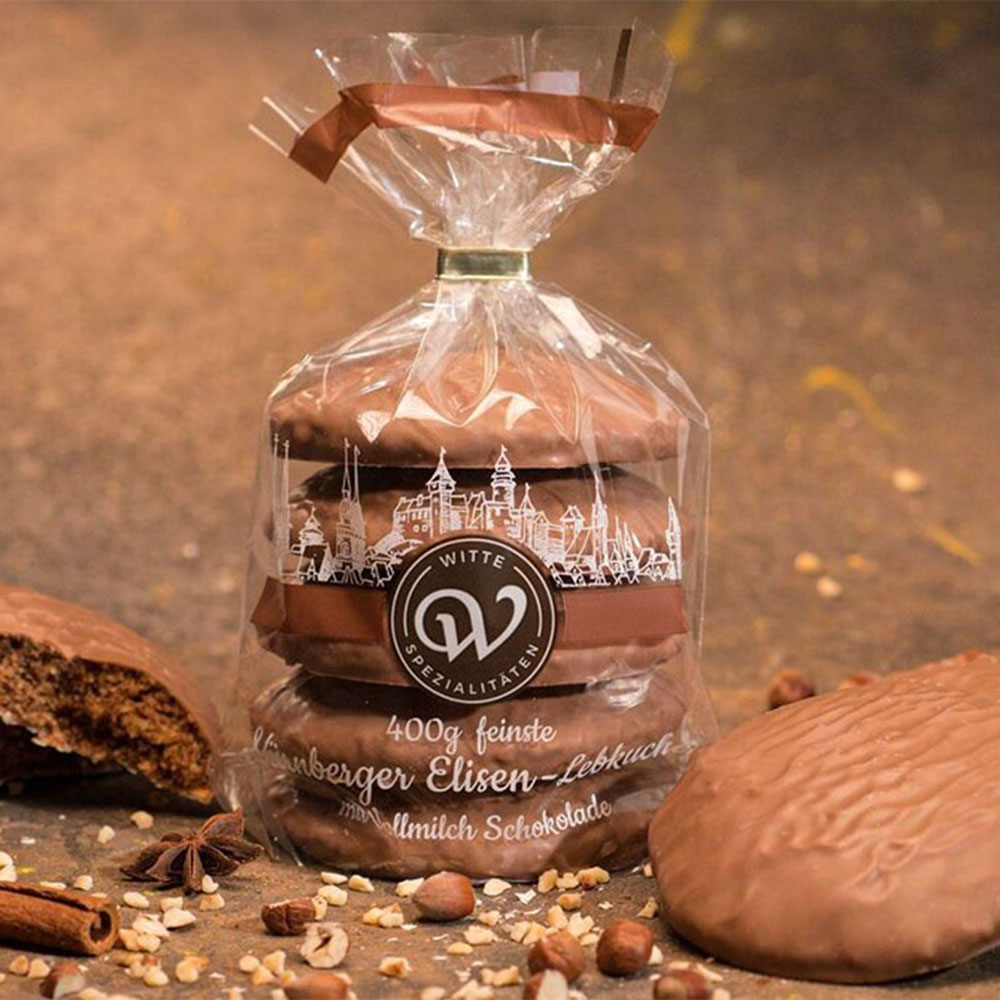 In dieser Variante enthalten sind fünf großzügige Stücke im Gesamtgewicht von 400 g. Der Teig basiert auf der bewährten „Elisen“-Rezeptur und weist einen Haselnuss-Kernanteil von 32 % auf, wodurch eine kräftige Nussstruktur und saftige Textur erzielt werden. Jedes Lebkuchenstück wird nach dem Backen mit hochwertiger Vollmilch-Schokolade überzogen – dieser Überzug verleiht dem Klassiker eine elegante Note und verbindet das lebkuchentypische Gewürz- und Honigaroma mit schokoladiger Finesse.