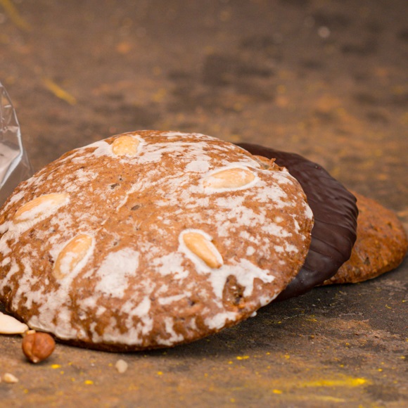 Zum Einsatz kommen erlesene Haselnüsse mit einem Kernanteil von etwa 32 %, Zucker, Hühnereiweiß, Marzipan (Mandeln, Zucker, Eiweißpulver), Orangeat/Zitronat, Weizenmehl, Lebkuchengewürz, Bienenhonig, Oblate (aus Weizenmehl und Stärke), sowie bei den schokolierten Varianten eine Kuvertüre mit Kakaomasse, Kakaobutter, Emulgator Sojalecithin und Vanilleextrakt. Bei den glasierte Varianten wird der Teig zusätzlich mit Zuckerglasur überzogen. Diese sorgfältige Zusammensetzung verbindet traditionelle Rezeptur mit handwerklicher Präzision.