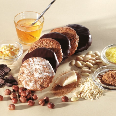 Verarbeitet werden hochwertige Haselnüsse mit einem Kernanteil von 32 %, Zucker, Hühnereiweiß, Marzipan (aus Mandeln, Zucker und Eiweißpulver), Orangeat und Zitronat mit Glukose-Fruktose-Sirup, Orangenschalen und Zitronenschalen, Weizenmehl, eine abgestimmte Lebkuchengewürzmischung, Bienenhonig, Kuvertüre (bei den schokolierten Varianten: Kakaomasse, Zucker, Kakaobutter, Emulgator Sojalecithin, Vanilleextrakt), ein Backtriebmittel (z. B. Natriumhydrogencarbonat) sowie eine Oblate aus Weizenmehl und Stärke. Der Nusskern sorgt für Aroma und Textur, die unterschiedlichen Veredelungen bringen optische und geschmackliche Akzente – Glasur für eine zarte Süße, Schokolade für eine edle Hülle.
