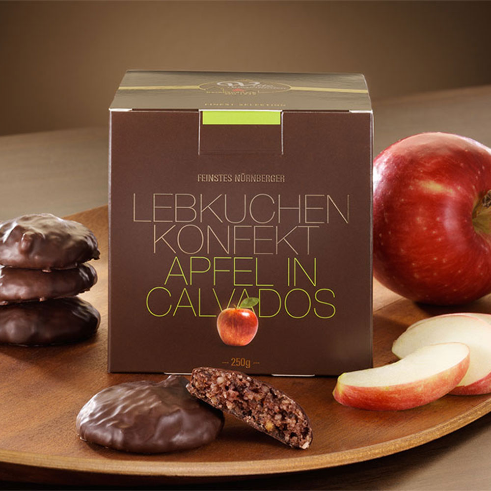 Ein edles Konfekt mit charaktervoller Frucht- und Brandnote – die perfekte Symbiose aus feinem Lebkuchen, saftiger Apfelfrucht und Calvados-Eleganz.