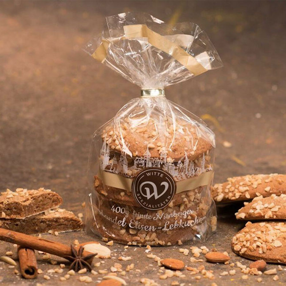 Diese Spezialität besteht aus fünf Stück Lebkuchen im Beutel mit einem Gesamtgewicht von 400 g. Der Teig zeichnet sich durch einen beeindruckenden Mandel-Kernanteil von 32 % aus, wodurch eine besonders saftige Textur und eine ausgeprägte Mandelaromatik entsteht. Dieses Format richtet sich an Liebhaber nussiger Lebkuchen mit klarer Zutatenbasis und traditioneller Herstellung.