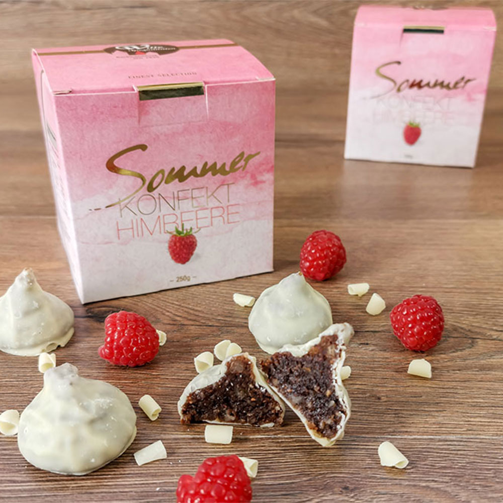 Ein sommerlich-feines Konfekt mit fruchtiger Himbeernote, elegant umhüllt von weißer Schokolade – eine raffinierte Kombination von Zartheit und Aroma.